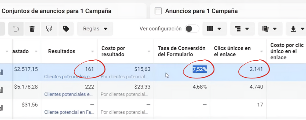Por lo que, de 2.121 personas que le dieron clic al anuncio, solo 161 lo completaron, dando como resultado una Tasa de Conversión del Formulario de 7.52%. |